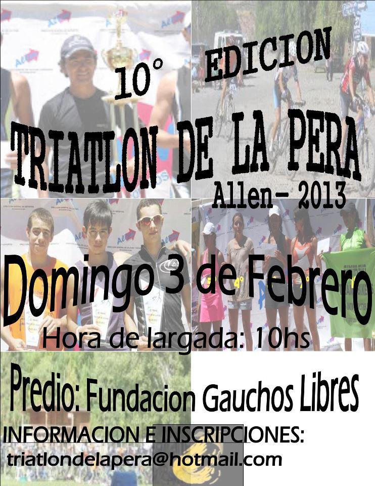 El clásico Triatlón de la Pera ya confirmó su realización para el 2013. Se trata de la 10º edición y será -como es costumbre- luego de los días en que la comunidad celebra la Fiesta Nacional de la Pera. La propuesta será individual y por equipos, con tramos de natación, ciclismo y pedestrismo. Más info en Bien de Allen!