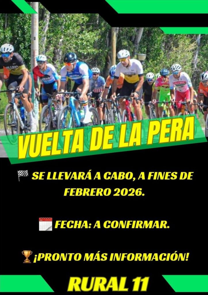 La convocatoria más inmediata sería la vuelta ciclística que recorre calles rurales entre Allen y Roca. La Vuelta de la Pera se ha convertido en una competencia clásica con el correr de los años. Para este 2026, desde las redes sociales, se lanzó un anuncio para anticipar su realización e ir ilusionando a los ciclistas. ‘Pirincho’ Barrera, líder de los entrenamientos controlados de la Rural 11, compartió un afiche hace algunos días. Si bien no da fecha exacta, confirma la cita para fines de febrero.