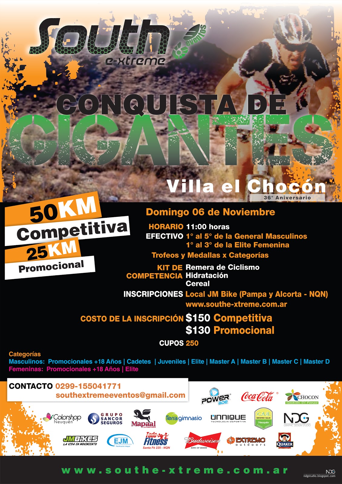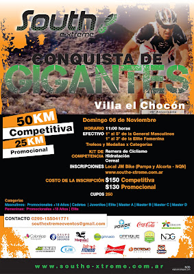 En apenas unas semanas, la villa neuquina será el escenario de una prueba de mountain bike. Como si al paisaje le faltara algo, South E-xtreme Eventos le suma una carrera que promete dar que hablar. Se trata de Conquista de Gigantes. Toda la info que necesitás, en este afiche promocional que compartimos en Bien de Allen!