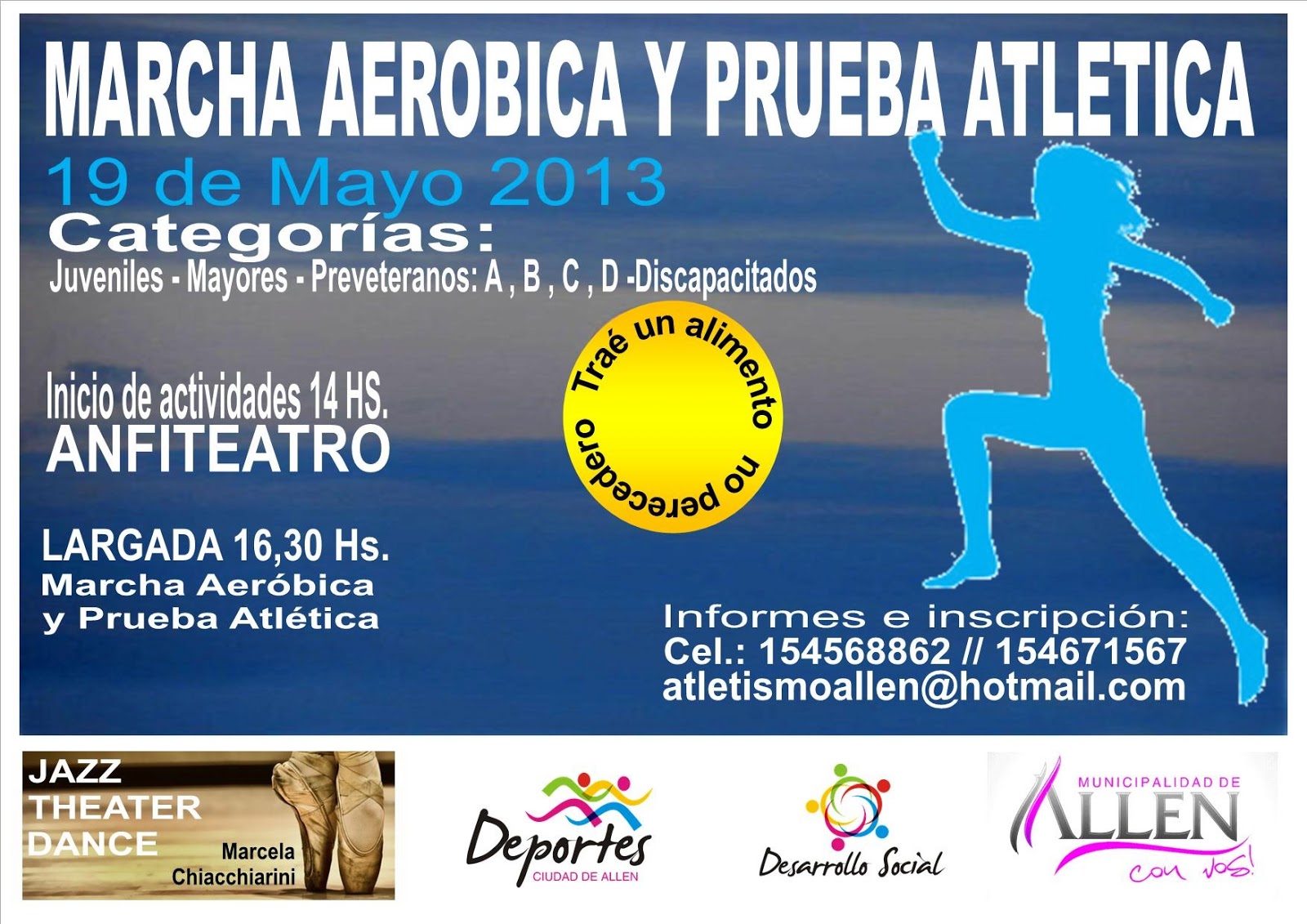 Por otro lado, se pondrá en marcha una prueba atlética con caminata familiar. Esta cita está prevista para el domingo 19 de mayo, a partir de las 14 hs. Será una convocatoria gratuita, pero solidaria. Se pide que todos los participantes acerquen un alimento no perecedero. Esta es una iniciativa en conjunto de la academia de danzas de Marcela Chiacchiarini y el personal del área de deportes local. Podrán anotarse atletas juveniles, mayores y veteranos. También está abierta la invitación para atletas especiales. La largada se espera para las 16.30 hs, en el Anfiteatro Municipal de Av. Libertad entre Sarmiento y Alem.